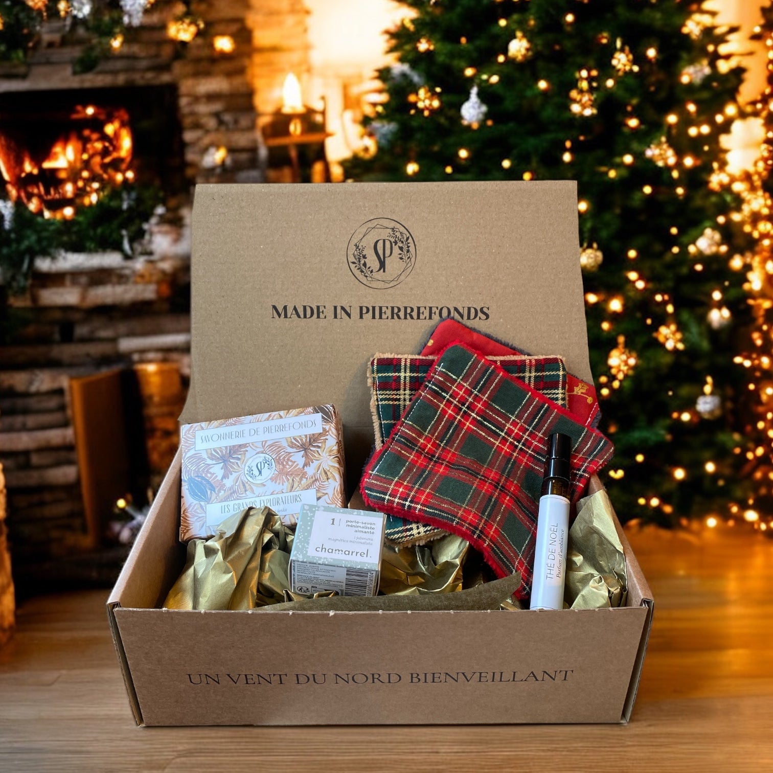 Ce coffret accessible est composé d'un savon artisanal surgras (100g) "Les grands explorateurs" enrichi au beurre de cacao, d'un porte-savon aimanté, de trois petites lingettes lavables de Noël et d'un mini-parfum d'ambiance "Thé de Noël" 10ml.